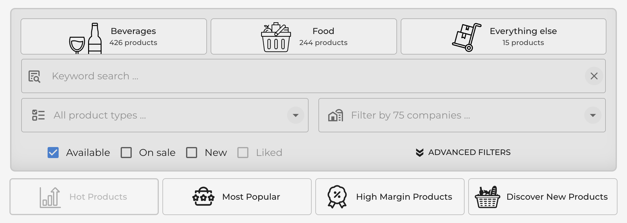 This popular filter limits products to those sold or delivered by a specific company. If, for example, you only want to see products from your three favorite producers, you can set them in the Suppliers filter and see a combination of all their products at once.