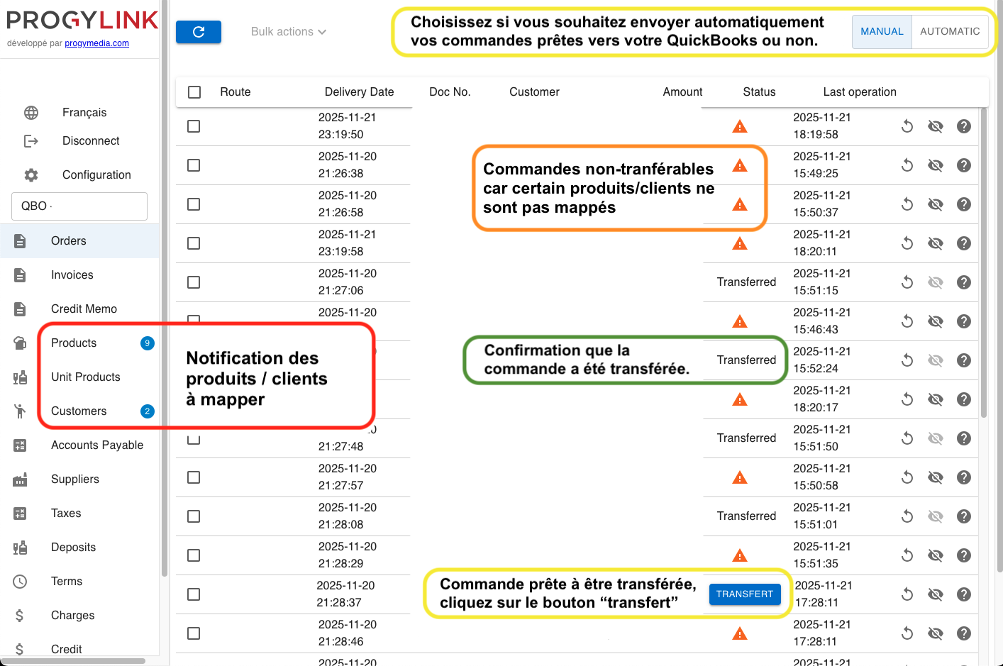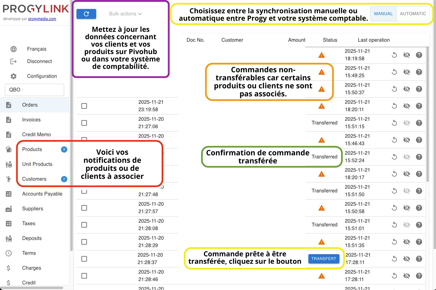 Une fois que vous avez obtenu vos accès Progylink et synchronisé votre système comptable avec vos comptes PivoHub, voici quelques informations concernant le tableau de bord des commandes.