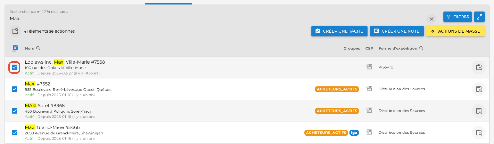 1- Dans le module « Client », veuillez sélectionner les clients que vous souhaitez ajouter au groupe en cochant les cases situées à gauche.