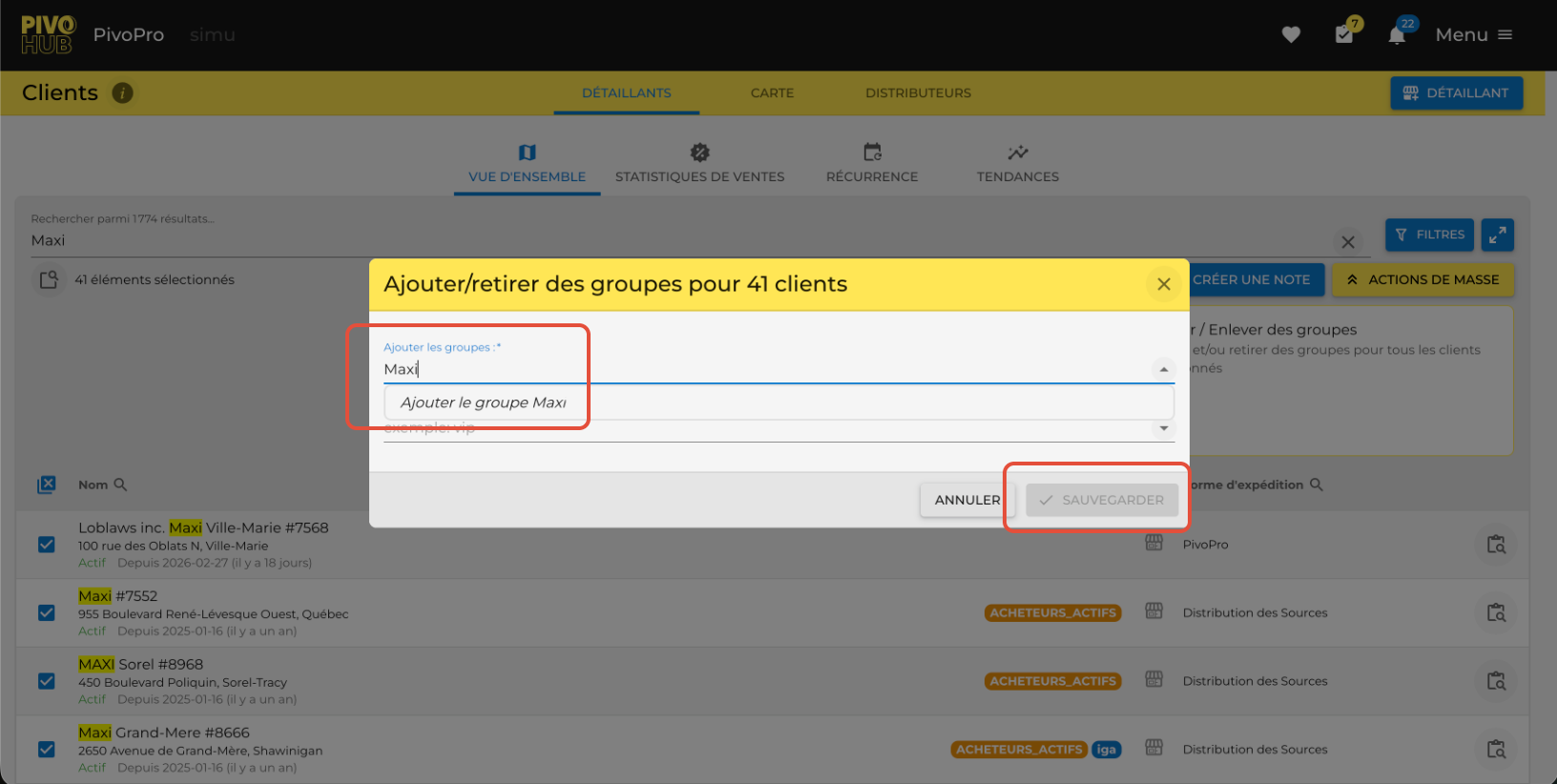 3- Sélectionnez le groupe dans lequel vous souhaitez intégrer les clients choisis, ou créez un nouveau groupe en entrant son nom dans la case « Ajouter les groupes ». Puis, cliquez sur « Sauvegarder ».