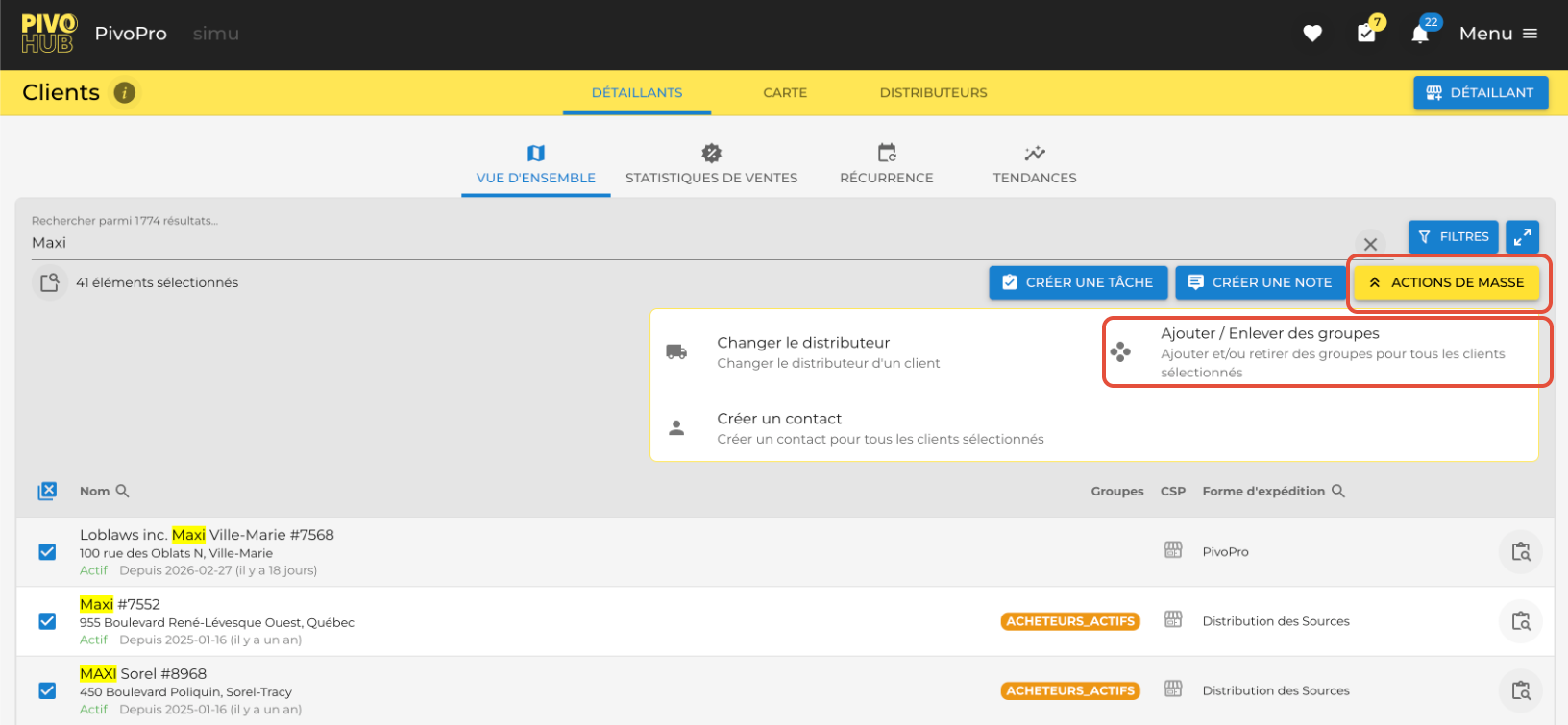 2- Une fois que vous avez sélectionné tous les clients que vous souhaitez ajouter à un groupe, cliquez sur le bouton intitulé « action de masse », puis sélectionnez « Ajouter/Enlever des groupes ».