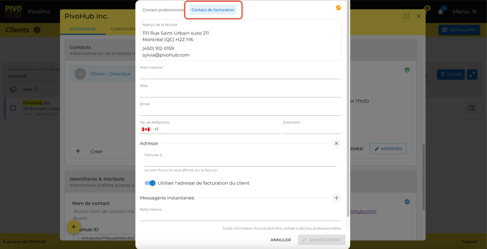 Avoir un contact de facturation vous permettra d’avoir le bon nom, adresse et courriel de facturation pour un ou plusieurs clients. Celle-ci se retrouvera sur votre facture afin de vous assurer de vous faire payer par le magasin ou la maison mère.